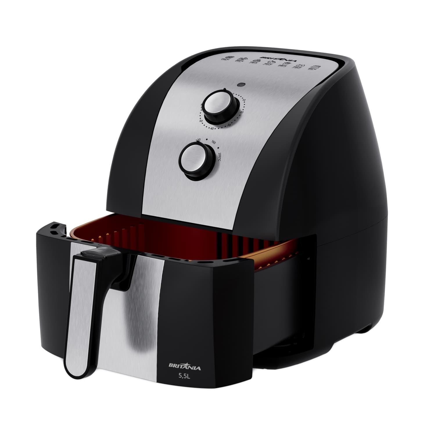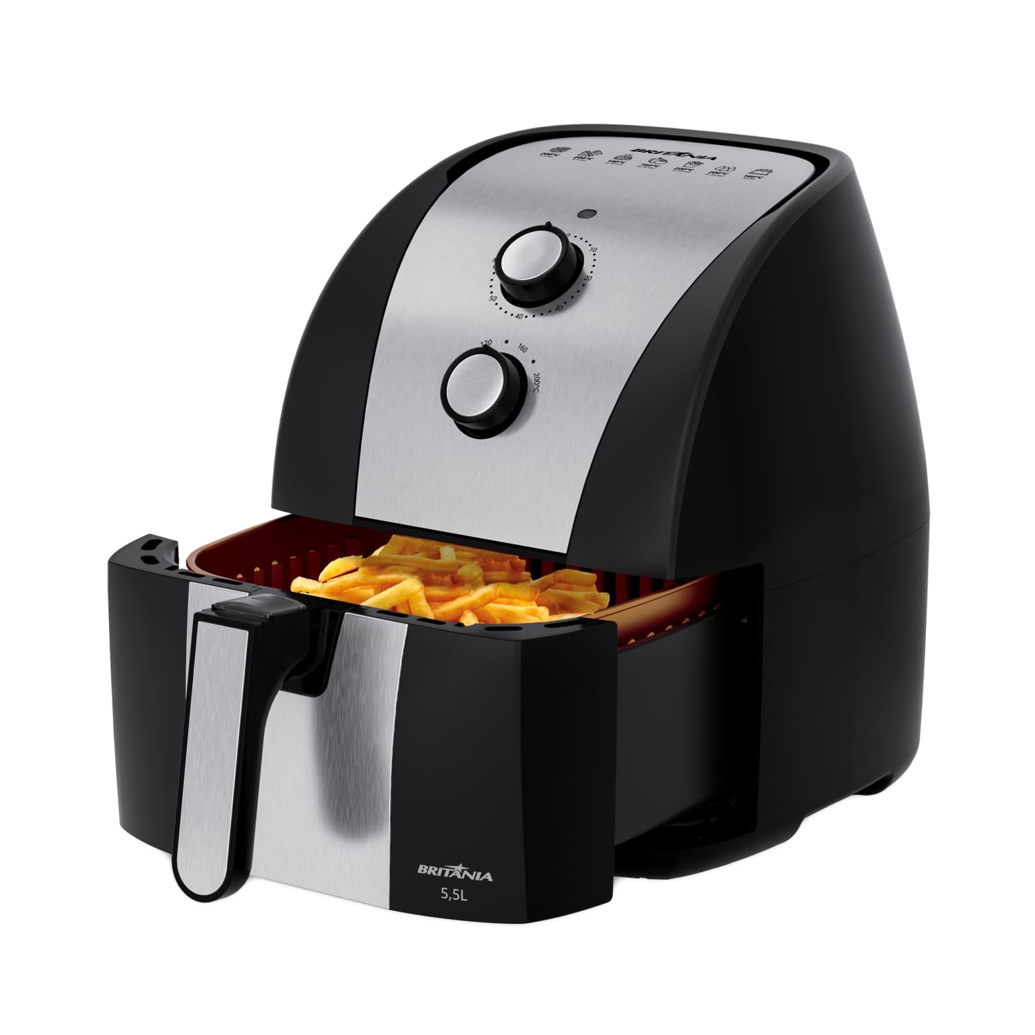 ¡La Freidora Air Fryer Britania BFR51 de 5,5L con 1500W es ideal para quienes buscan practicidad en la cocina!. Desarrollado con una increíble capacidad de 5,5 litros, te permite preparar grandes porciones para toda la familia, lo que significa que cabe mucha más comida a la vez. Con una potencia de 1500W y control de temperatura de hasta 200°C, podrás preparar rápidamente recetas, desde platos sencillos hasta los más complejos. Sin olores ni humo. La cesta cuadrada y extraíble de esta Air Fryer tiene un revestimiento antiadherente Gold con 4 capas protectoras, garantizando resistencia a la abrasión y evitando que los alimentos se peguen, facilitando la limpieza. La tecnología Air Flow, con circulación de aire caliente a 360°C, garantiza que tus platos se cocinen, se fríen o se asen de manera uniforme sin necesidad de aceite, promoviendo comidas más saludables. Haz tu día a día más práctico y sabroso con la Air Fryer Gold BFR51. ¡Vive en modo Britania y revoluciona tus comidas!